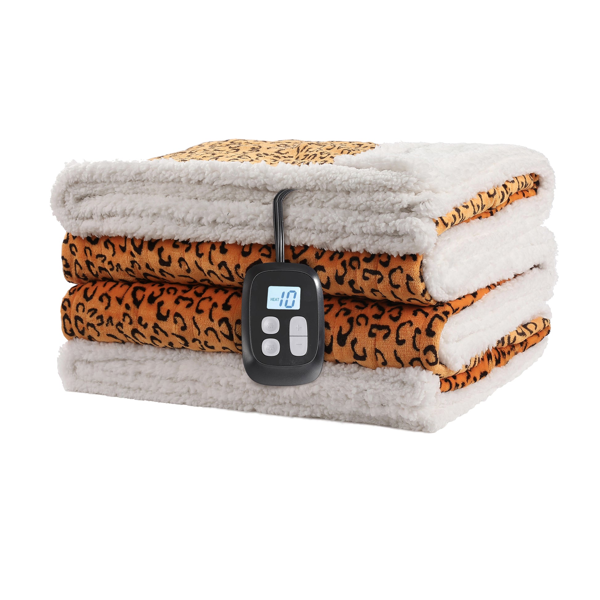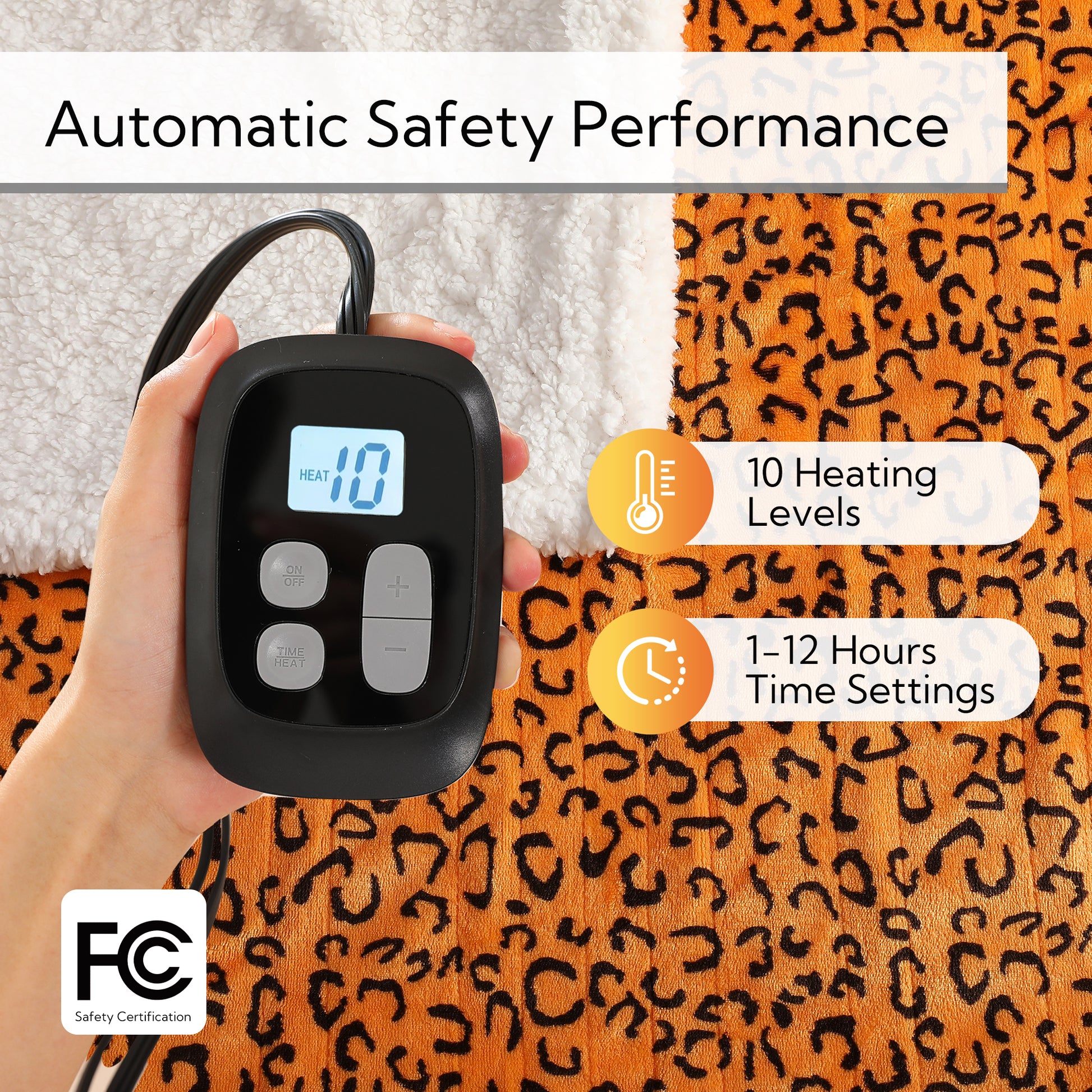 SUNNY HEAT Heated Electric Blanket Full Size 72'' x 84'' 6 Heating Levels & 1-10 Hours Auto Off , Leopard Black & Yellow
